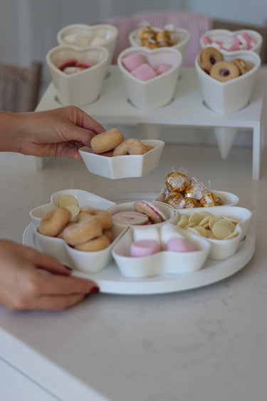Make sharing simple and stylish with this 7 piece white lazy Susan snacking station. Designed to sit at the centre of the table, it rotates smoothly to allow easy access for everyone, making it perfect for family gatherings, relaxed evenings and casual entertaining. Each section is ideal for serving snacks, sweets, fruit, crisps or dips, helping keep everything neatly presented, making it easy to style with any kitchen or dining decor.