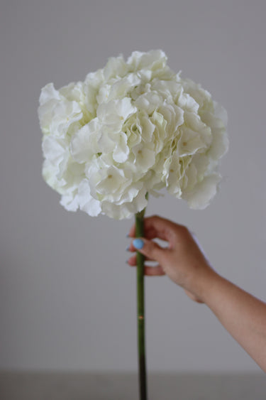 This white mop head hydrangea stem is full, realistic, and beautifully finished, making it a great choice if you love high quality faux flowers. One of those fake flowers that gives instant impact, it works well styled on its own or grouped with other stems for a fuller look.
