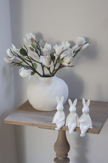 A pre-styled home décor bundle designed to be displayed exactly as shown. This arrangement features a dimpled ceramic vase filled with faux magnolia stems, paired with a set of sitting bunny ornaments to create a warm, seasonal focal point. The combination of textured ceramic, soft florals, and subtle decorative detail makes this bundle easy to style while keeping a calm, considered look.
