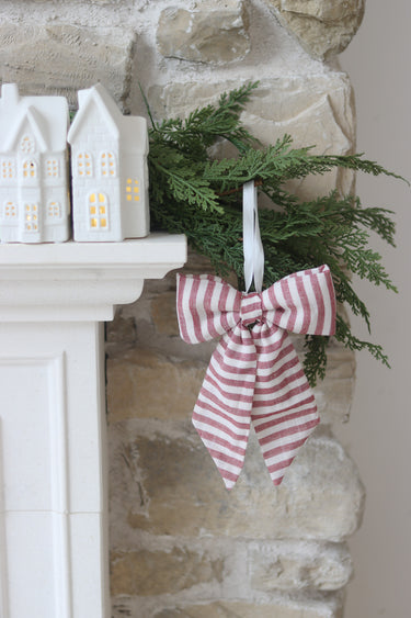 Bring a timeless Christmas look to your home with our Cranberry Red Striped Fabric Bow. Crafted from high-quality cotton in deep red and cream stripes, this oversized bow adds warmth and charm to any festive setting. Perfect for styling on wreaths, garlands, or gift displays, it’s a versatile accessory that complements both classic and modern Christmas themes. Measuring approximately 12 x 20 cm, it’s the perfect size to make a statement while blending beautifully with your seasonal decor.