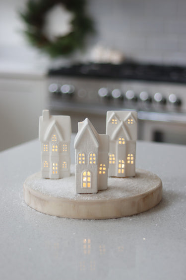 Minimal and elegant, the winter house Display Board Bundle brings soft festive light into any space. Three large led ceramic Christmas houses sit neatly on the white Paulownia board, creating a calm and balanced Christmas table decoration. Perfect for adding a cosy glow to your home this season.