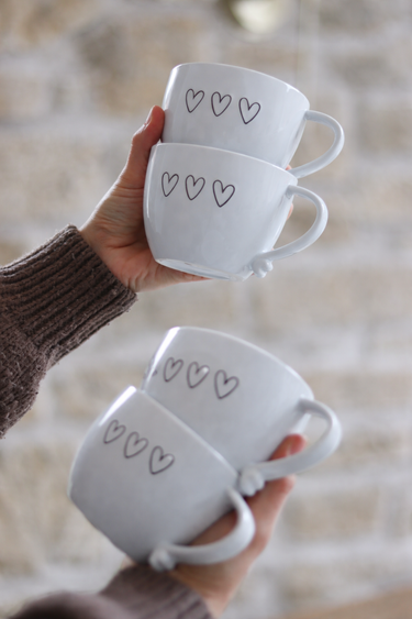 This mug set of 4 features matching heart handled designs finished with three black heart details on a clean white base. Crafted from stoneware, these coffee mugs are designed for everyday use, with a 350ml capacity that feels balanced in the hand.