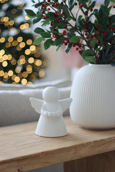 Place the angel beside a ceramic house, fluted jar or framed print, adding a single faux flower stem for a soft, intentional look. Perfect for creating a peaceful spot in any room.