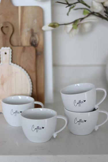 This cute ceramic mug set features four matching heart handled mugs finished on a clean white base with coffee-inspired detailing. Designed as everyday coffee mugs, each 350ml mug feels balanced in the hand and easy to use from morning to evening.