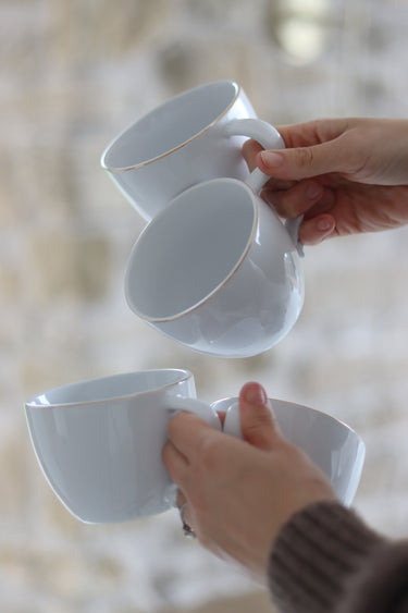 This ceramic mug set features four matching heart handled mugs finished in a clean white glaze with a fine gold rim. The detailing keeps the design refined, allowing these coffee mugs to feel decorative without losing their everyday practicality.