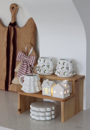 Create a refined festive display with the Christmas Mug Display Bundle, designed to bring warmth and texture to your Christmas styling. This ready-made set pairs three of our matt white Christmas mugs with scalloped ceramic coasters, heart tea spoons and glowing mini LED houses, all displayed on a two-tier natural stand. Perfect for kitchen counters, sideboards or shelving, it’s a beautiful way to showcase your Christmas mugs while adding soft light and seasonal charm to your home.