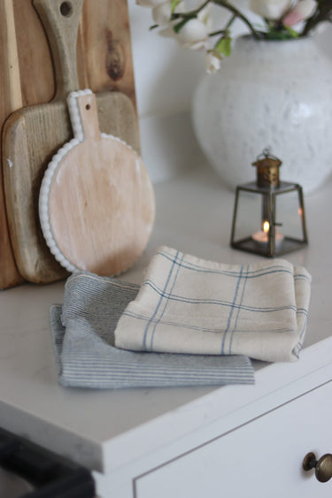 Refresh your bathroom or Kitchen with our 100% Cotton Beach House Towel Set, featuring two beautifully woven designs: one with fine blue stripes, the other with classic blue checks. Made from soft, absorbent cotton, these towels offer a lightweight feel with excellent drying power—perfect for relaxed coastal interiors. Their timeless patterns and quality finish bring a breezy, beach house charm to your home.