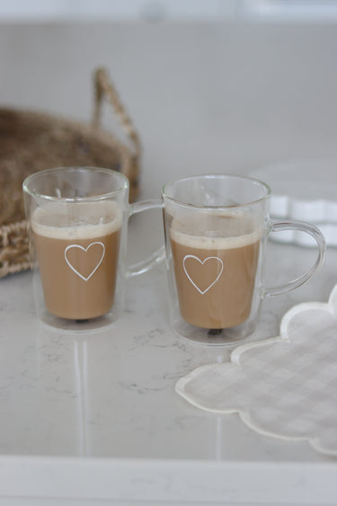 Slim Double Walled Glass Mug Set - 2 Piece -Single Heart/White