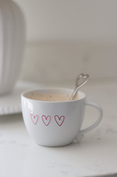 This stoneware coffee mug features a heart-shaped handle and three pink heart details on a smooth glazed finish. With a 350ml capacity, it’s a comfortable size for a regular mug of coffee, while still working just as well for tea.
