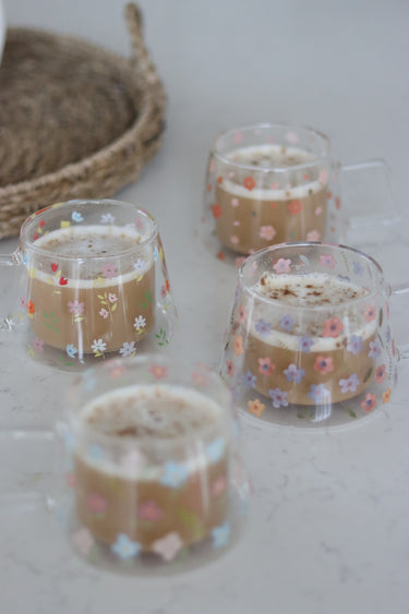 Wrap Around Double Walled Glass Mug Set – 4 Piece – Florals