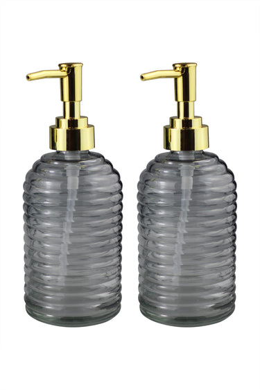 Vendus dans un ensemble de 2 pièces disponible avec un dessus de pompe en plastique doré, avec une finition ondulée, ce sont des distributeurs de savon pour les mains en verre uniques mais élégants et abordables, finis dans un émail gris fumé.