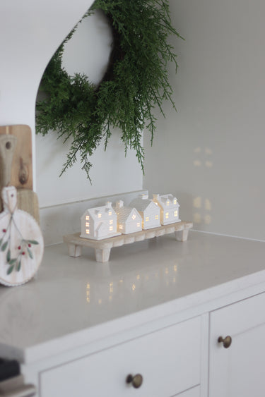 This Whitewash Village Bundle captures classic festive charm with a soft neutral palette. The LED ceramic houses sit neatly on the raised tray, making an effortless Christmas table decoration or windowsill display.