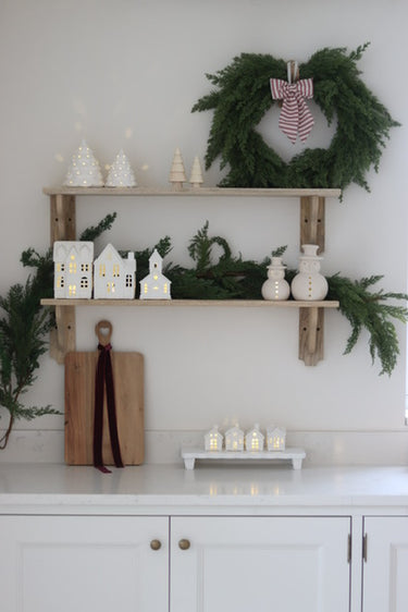 Hang the wreath centrally and layer your shelves with the LED snowmen and scalloped trees at either end for height. Group the larger LED Christmas houses and church in the middle, mixing in mini ceramic houses and wooden trees for texture. Use the raised tray to elevate smaller pieces and complete your glowing Christmas display. Add greenery or faux snow to finish the look.