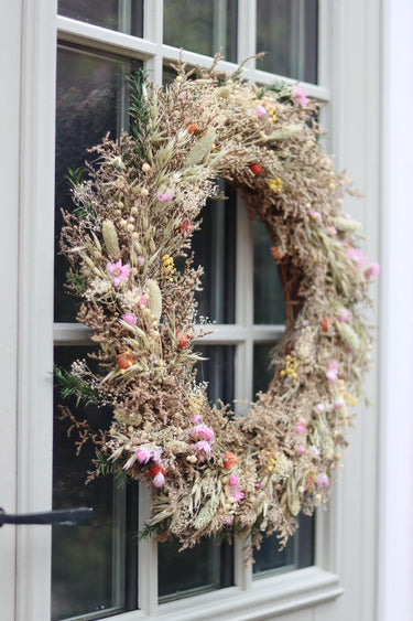 Deze neutraal-getinte gedroogde herfstkrans is vervaardigd uit een mix van bewaard gebleven natuurlijk gebladerte en biedt een zachtere kijk op seizoensgebonden styling. Met pampa's, zaaddeuken en gedroogde bladeren in tarwe-, steen- en beige tinten, is het een perfecte keuze voor herfstliefhebbers die de voorkeur geven aan een meer ingetogen look.