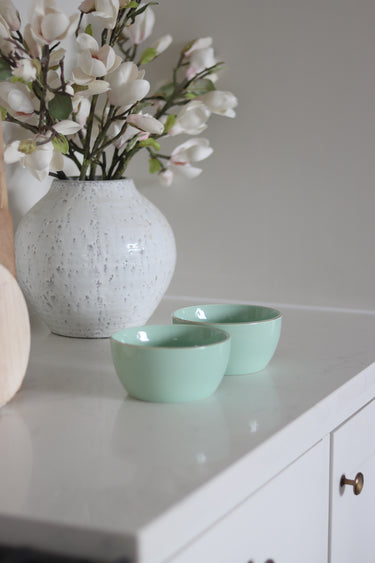 This coordinated bowl set features two matching bowls finished in a green glaze with a fine gold trim. The colour allows each piece to sit comfortably as a green bowl, adding depth to the table while still keeping a clean silhouette.
