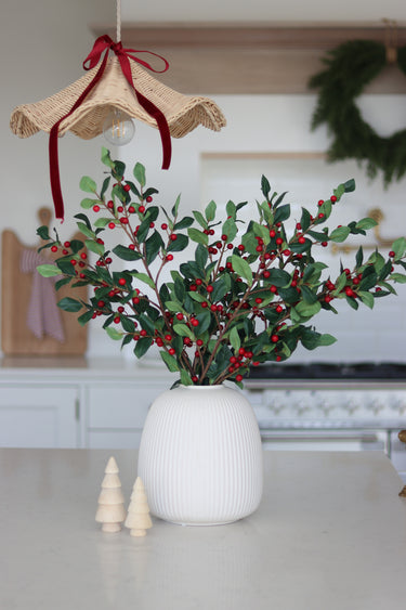Our Faux Red Berry Stem adds a bold pop of festive colour to your winter styling. Each stem features detailed red berries with a natural finish, designed to bring warmth and richness to your Christmas displays. The wired structure allows you to bend, shape and position the stems with ease, whether you’re creating a full vase arrangement, weaving them into garlands, or adding depth to wreaths and trays. Display alone for a striking look or pair with greenery, pinecones or white berries for a perfectly balanced arrangement.