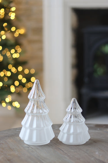 The Frosted Glass Tree Set includes both large and small sizes, each crafted from frosted glass that diffuses light gently. A simple, elegant addition to your Christmas decor that pairs beautifully with white and metallic tones.