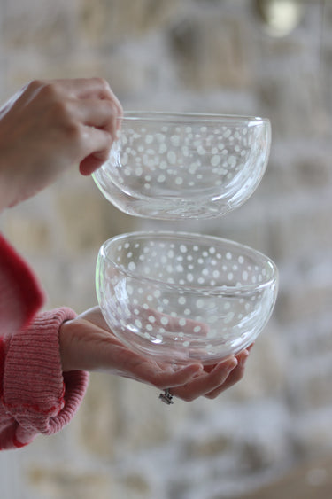 This set of bowls includes two matching glass bowls finished with a soft white polka dot design. Made with a double wall glass construction, the bowls feel light to handle while helping to insulate contents for comfortable everyday use.