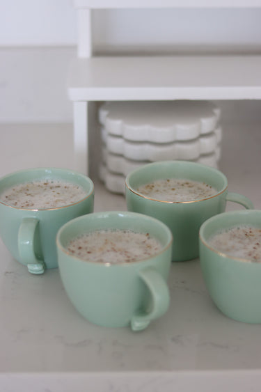 This green mug set includes a set of 4 ceramic mugs with heart-shaped handles and a subtle gold rim finish. The soft green tone gives the mug set a decorative, considered look while remaining practical for everyday use, making it a pretty mug set that works well in coordinated kitchens.