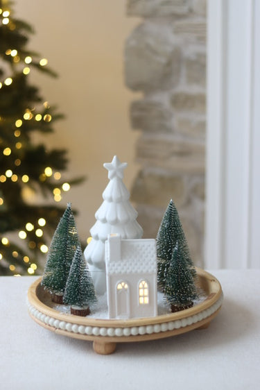 Create a timeless festive display with the Winter Round Village Bundle. This ready-made set combines natural textures with soft LED light to form an elegant Christmas table decoration or sideboard display. The beaded tray offers a stylish base for the ceramic trees and glowing LED house, while the brush trees add layered texture and height. Designed for effortless Christmas styling, it brings warmth and harmony to any room.